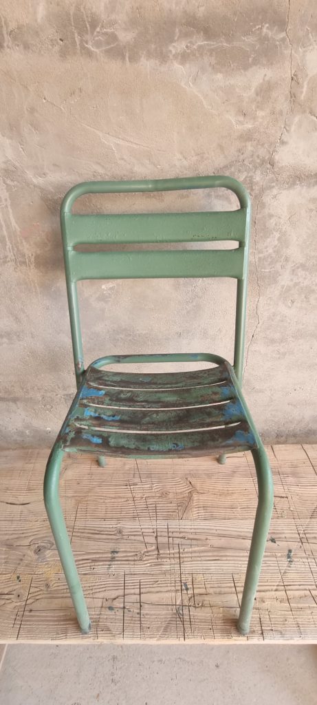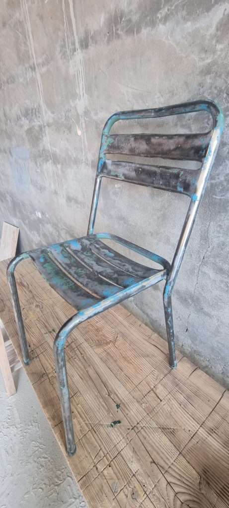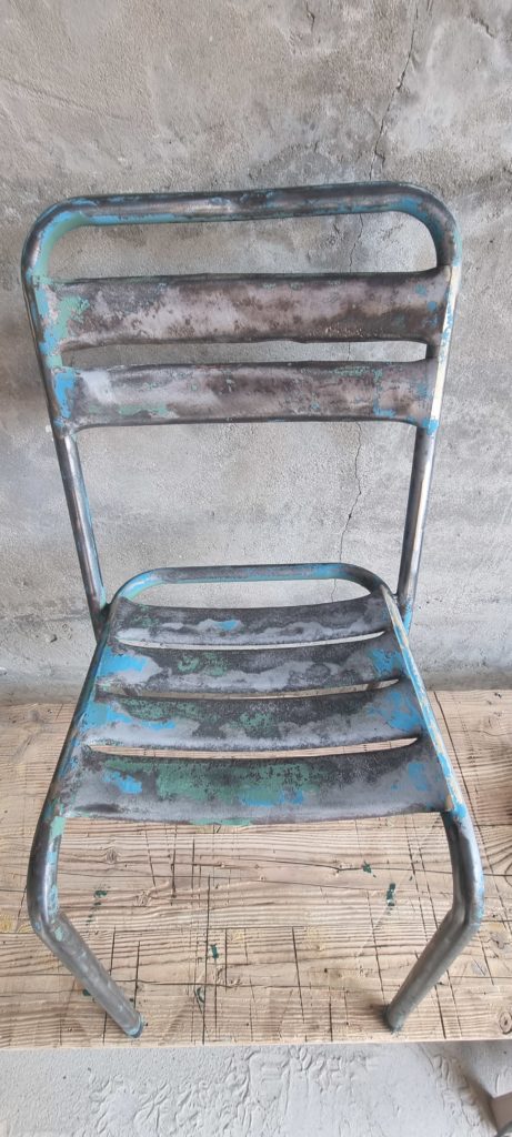 Sablage chaise en fer années 50 avec restes de peinture selon souhait clientèle